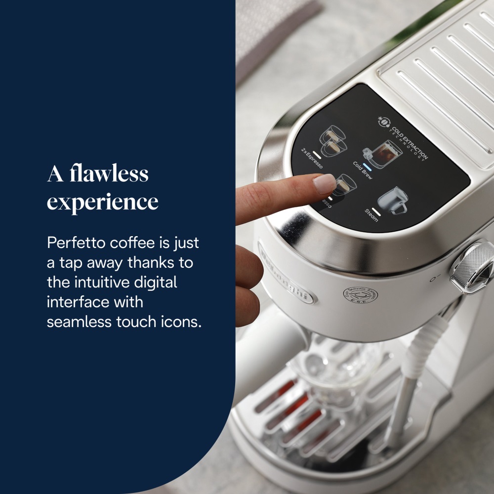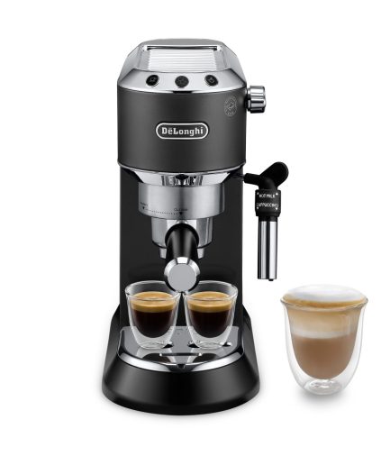 Stylish and compact coffee machine designed to complement your kitchen worktop. With its shiny stainless steel body and matt black finish, the Dedica espresso maker adds a touch of authentic Italian design to any kitchen. Enjoy a rich, smooth Espresso and use the Adjustable Cappuccino System to steam milk or finish your coffee with creamy milk foam.